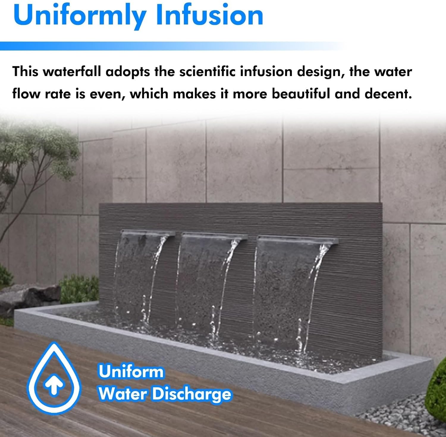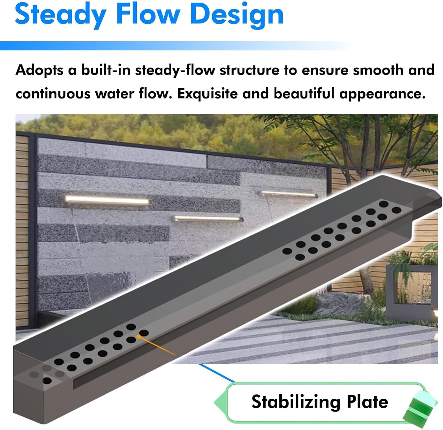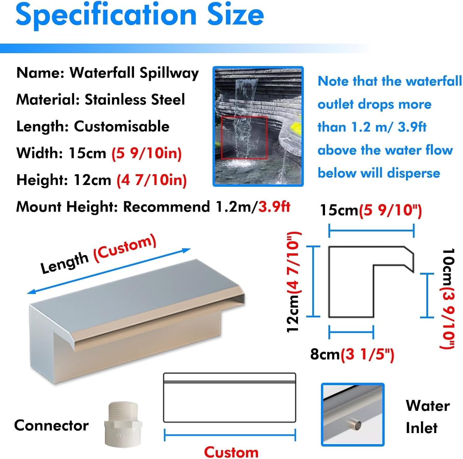 This design effectively enhances the calming sound and sight of falling water, allowing you to enjoy the soothing sensations that come with it. The consistent and gentle will create a tranquil environment, making it an ideal addition to any outdoor or indoor setting.Specification:1. Name: Waterfall Spillway2. Colour: Black/ Silver/ Bronze3. Material: Stainless Steel 4. Length: Customisable 5. Width: 15cm (5 9/10in) 6. Height: 12cm (4 7/10in) 7. Mounting Height: Recommended up to 1.2m/3.9ft Features:1. 304 stainless steel needn't rust and deform 2. Simple style, into all kinds of landscaping styles 3. You can equip with a water pump (self-supplied)4. Smooth texture, no obstruction of water flow through 5. Good impact resistance, can withstand strong pressure of water flow 6. The inlet position is at the bottom of the default, please let us know if you need the back Package Included:1 x Waterfall Spillway1 x PVC ConnectorPumps/ Pictured Decor Not IncludedNotes:1. Due to differences in monitor and lighting effects, the actual color of the item may differ slightly from the color shown in the picture. Thank you!2. Please avoid measurement deviations of 1-3cm due to manual measurement.We guarantee that purchasing here is risk-free.If you receive a different or damaged item, please contact us before providing any feedback. We will resolve the issue for you.
