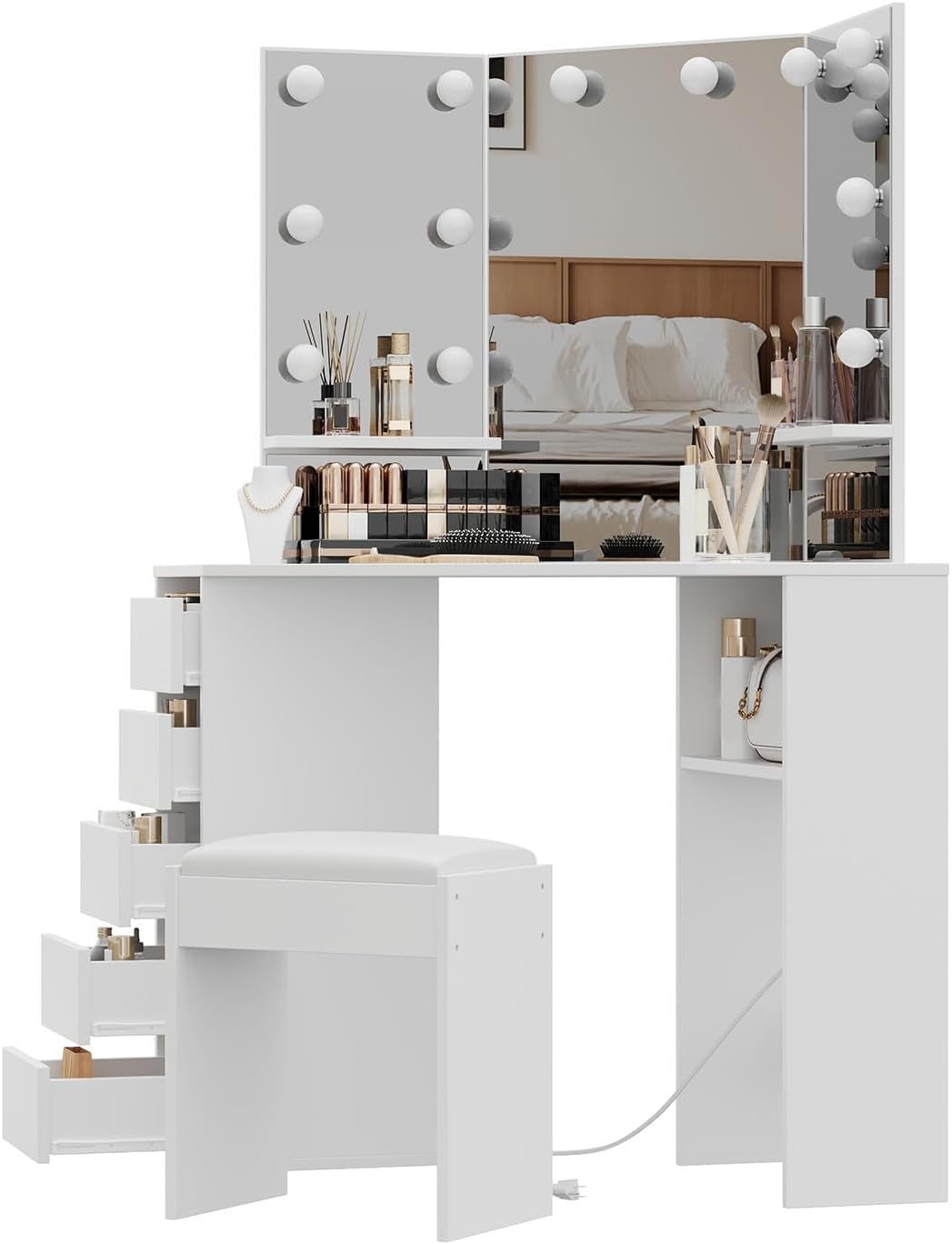 Material: MDFColor: White, Black and BrownSize: 21"D x 44"W x 56"HIncluding: Corner Vanity and StoolFunction: Charging station, Mirror with lightsNotice: 2 parcels